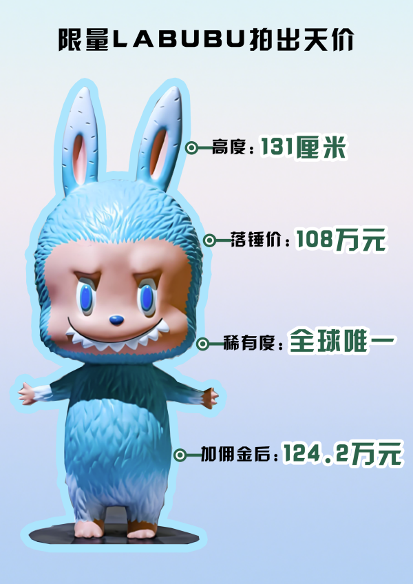 2025年6月10日,一件高131厘米的薄荷色初代LABUBU,以108萬元的價格落槌成交,創(chuàng)造了最貴LABUBU紀(jì)錄。