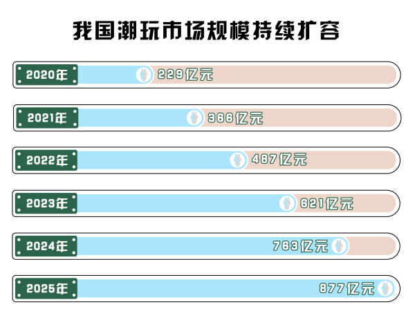 潮玩市場規(guī)模持續(xù)擴(kuò)張奠定基礎(chǔ)。據(jù)《2025-2030年中國潮流玩具深度分析及發(fā)展前景研究預(yù)測報告》數(shù)據(jù)顯示,2020-2024年中國潮流玩具市場規(guī)模已經(jīng)從229億元攀升至763億元,且預(yù)計2025年突破877億元。潮玩市場擴(kuò)容,大批消費者持續(xù)涌入,為培育LABUBU這樣的優(yōu)質(zhì)IP提供了肥沃的土壤。