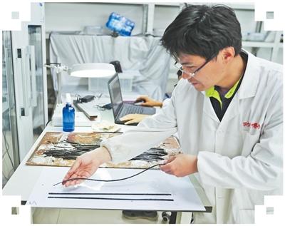 簡牘發(fā)掘、保護和修復(fù)是一場與時間的賽跑?!皠偝鐾恋闹窈嗆浀孟衩鏃l,非常脆弱,接觸空氣后極易氧化變黑,可能導(dǎo)致文字瞬間消失。”蔣魯敬說,在龍會河楚墓發(fā)掘中,他們采用“整體提取法”:以薄塑料板作“手術(shù)刀”,木托板為“擔(dān)架”,將整堆簡牘托起,并快速送往荊州文物保護中心。