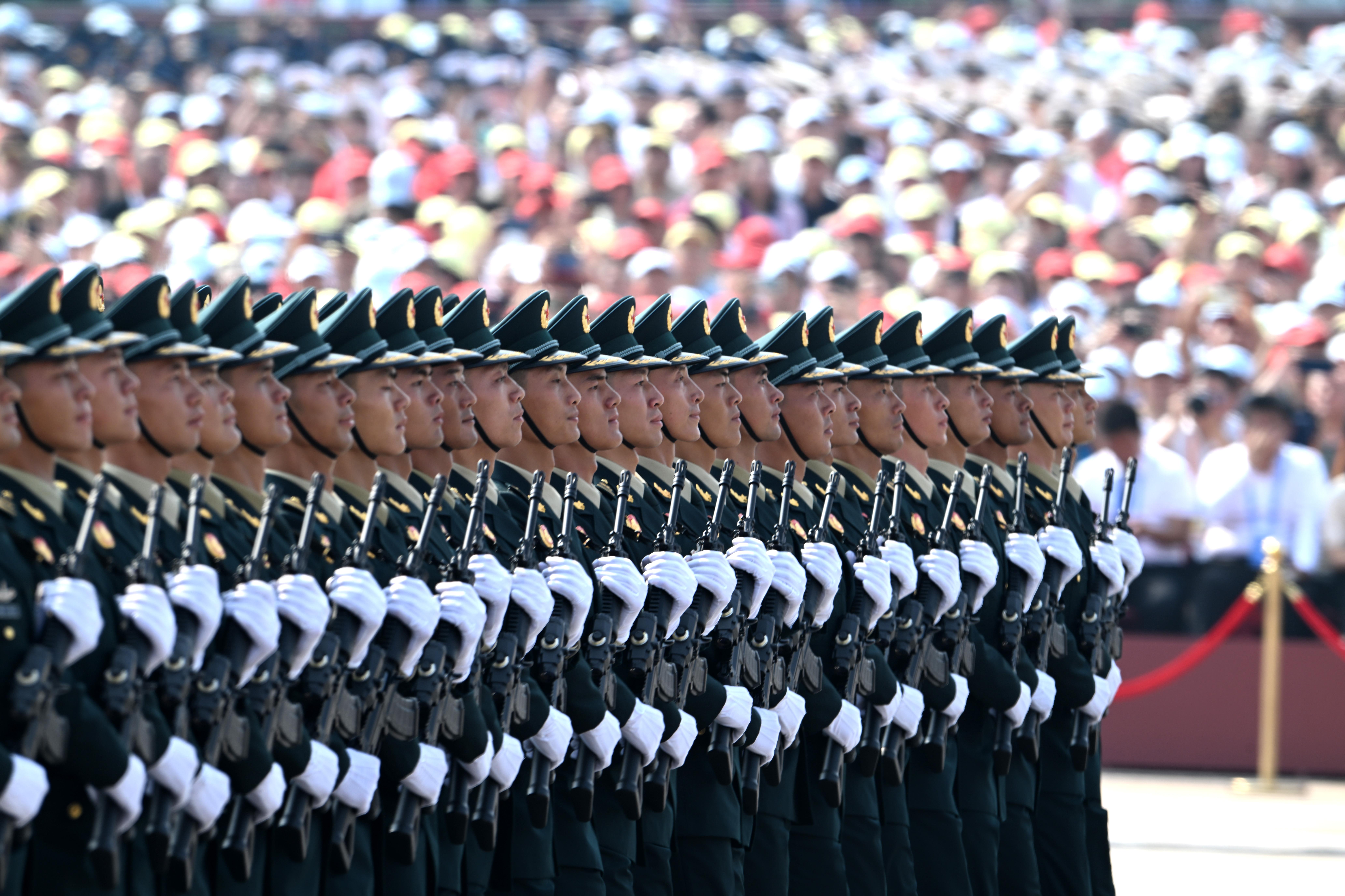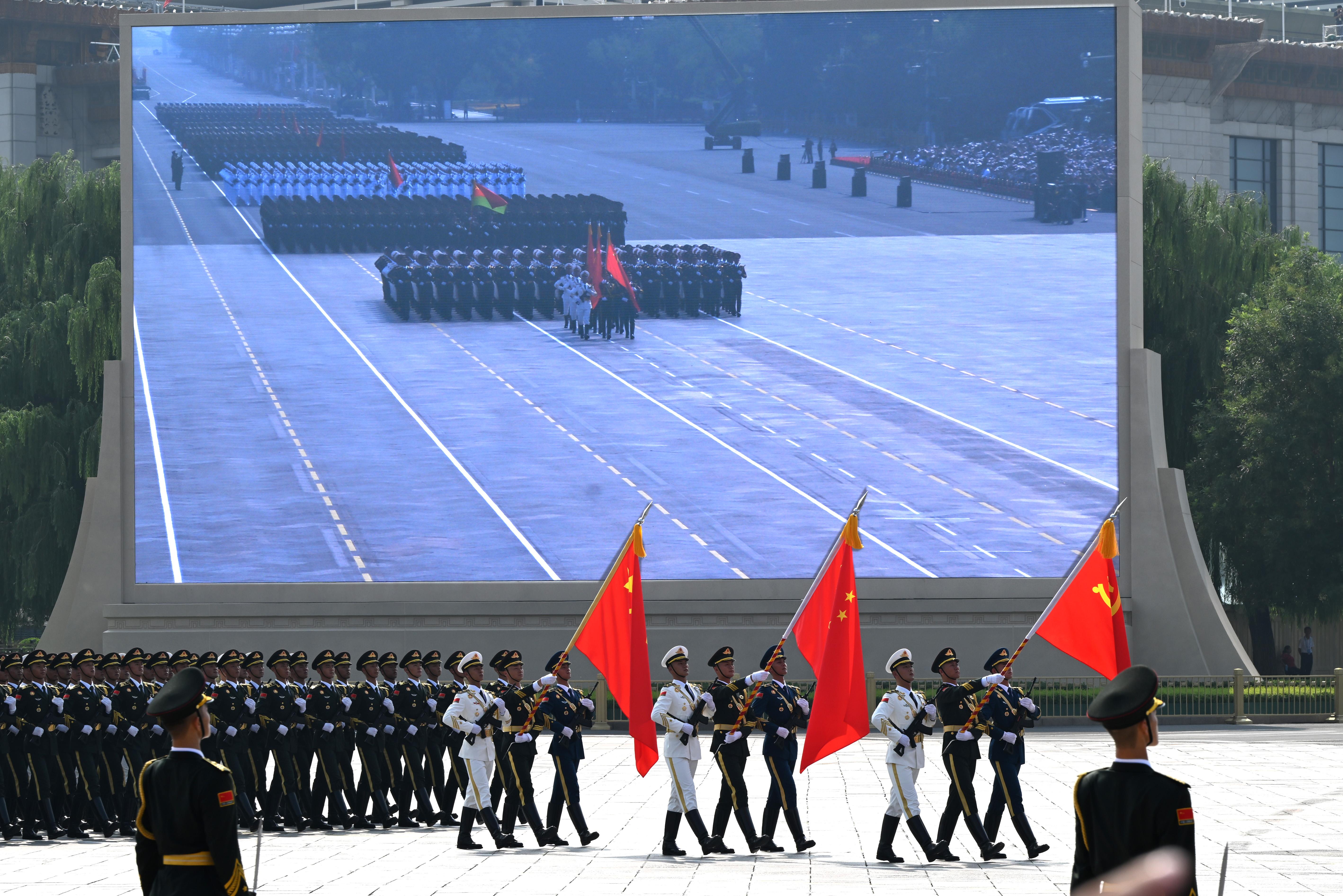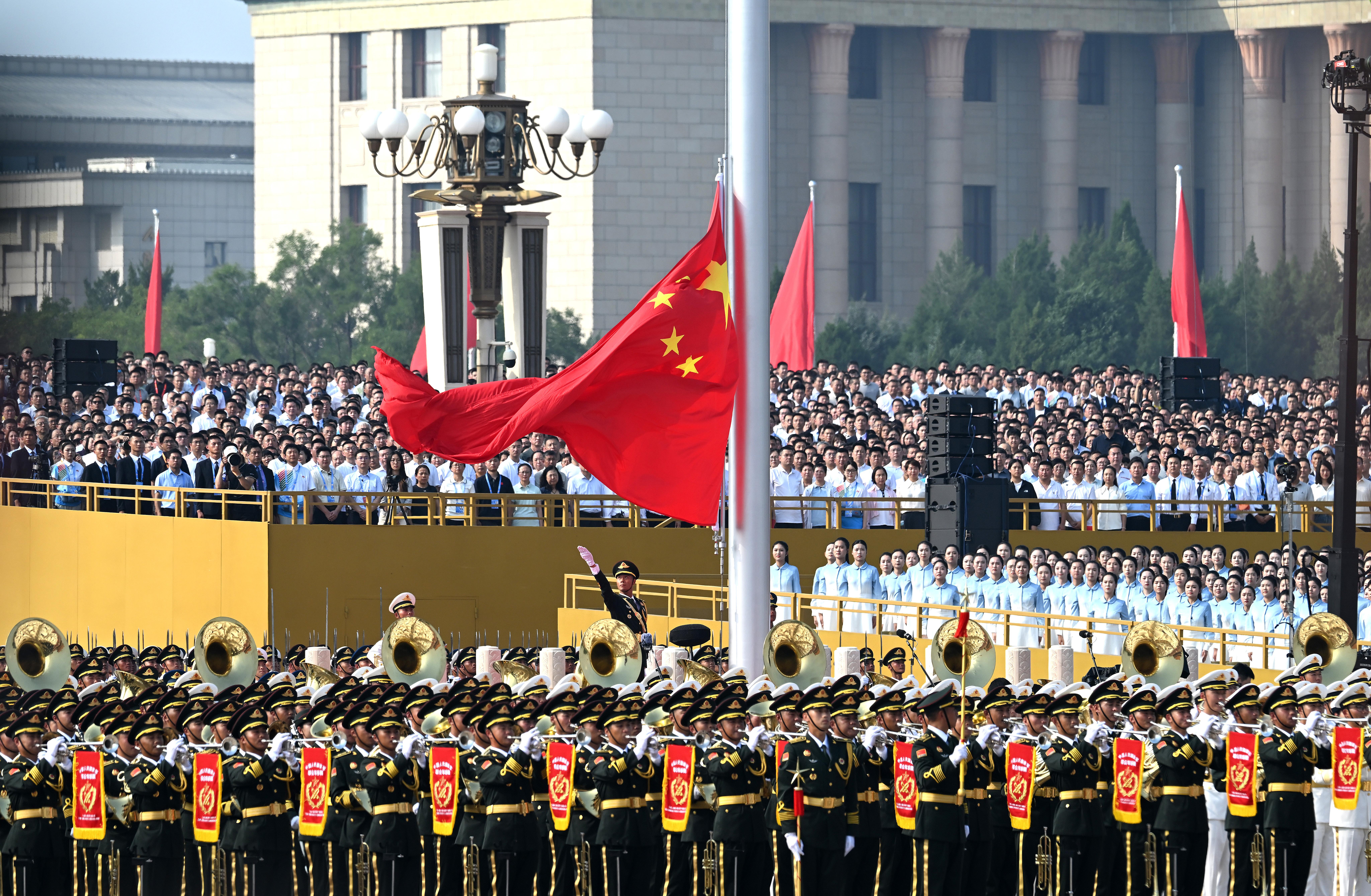 9月3日,紀(jì)念中國(guó)人民抗日戰(zhàn)爭(zhēng)暨世界反法西斯戰(zhàn)爭(zhēng)勝利80周年閱兵式在北京隆重舉行。這是天安門廣場(chǎng)舉行升國(guó)旗儀式。