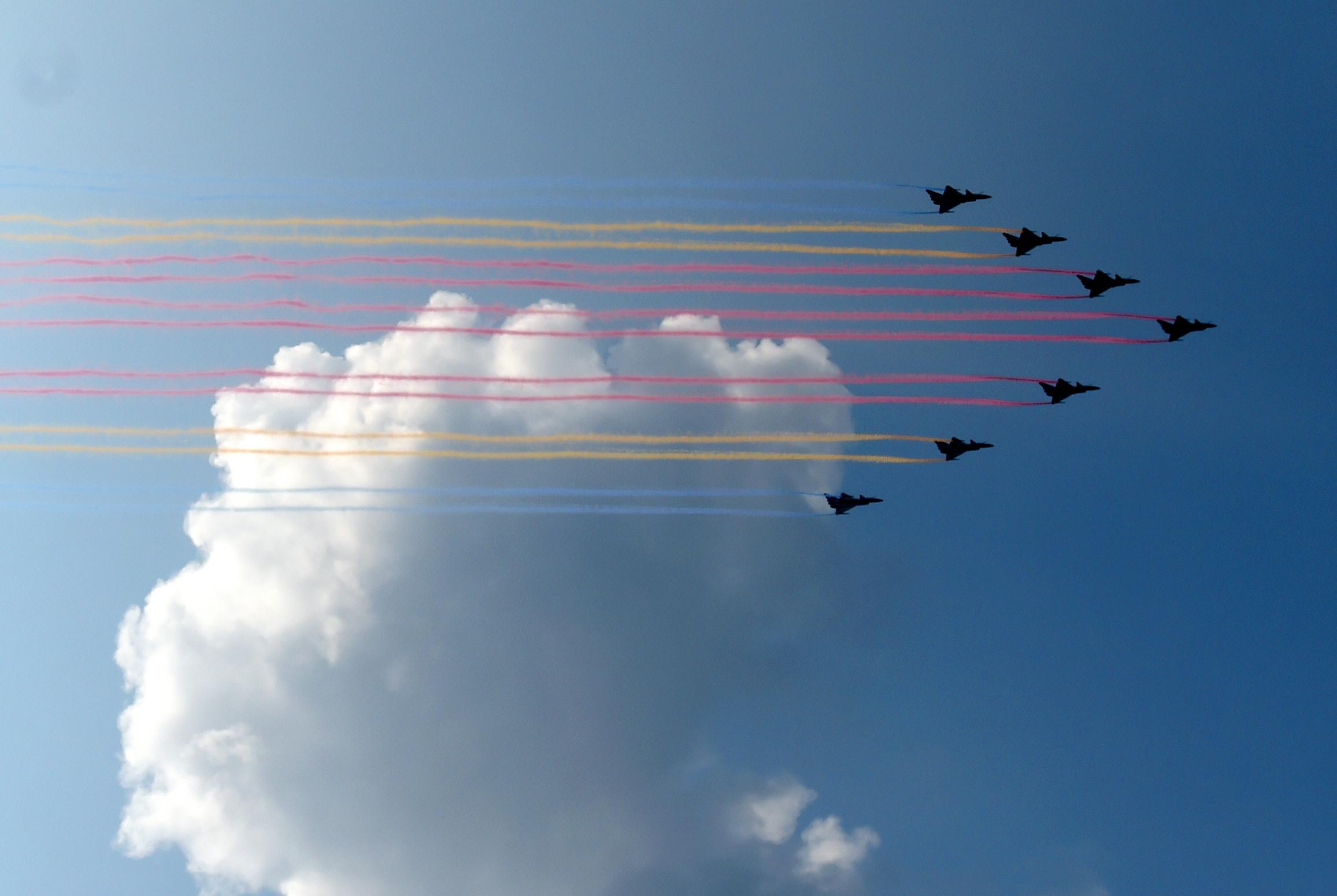教練機(jī)梯隊(duì)飛過(guò)天安門廣場(chǎng)上空。