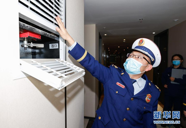 2月1日,消防監(jiān)督檢查人員在商務(wù)酒店內(nèi)對(duì)消火栓壓力進(jìn)行測(cè)試。