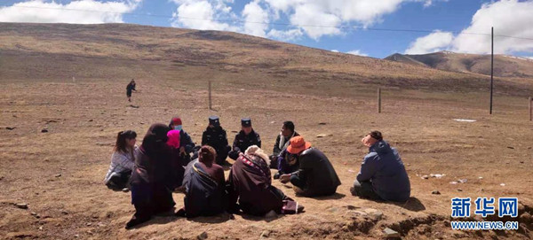 在青海省果洛藏族自治州瑪沁縣優(yōu)云鄉(xiāng),糾紛調(diào)解工作組的多杰扎西(后排穿警服右)、仁青卓瑪(后排穿警服左)和牧民們席地而坐,了解矛盾的詳細(xì)情況(4月18日攝)。