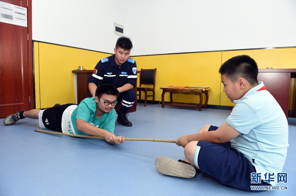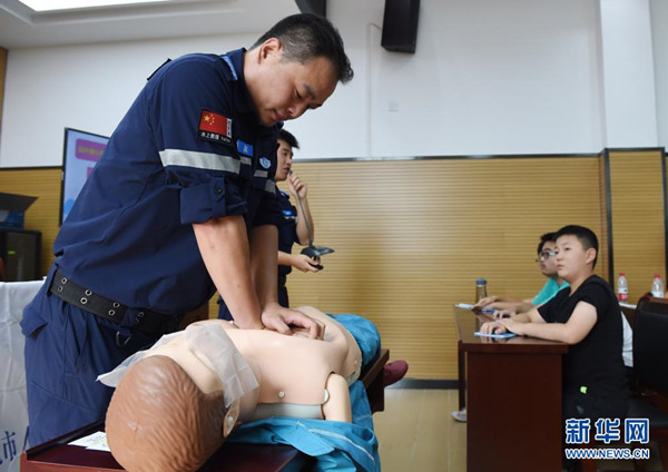 7月15日,在合肥市常青街道姚公社區(qū),合肥市水上應(yīng)急救援隊(duì)的隊(duì)員用現(xiàn)場演練的形式為孩子們介紹溺水后自救互救知識(shí)?!?/span>