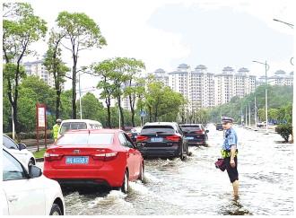 近日,江西省新余市遭受強降雨襲擊,城區(qū)部分道路積水嚴重,不少車輛及群眾被困。新余市公安局交警支隊民警迅速奔赴搶險救援第一線,全力開展排險解困工作。圖為民警涉水疏導(dǎo)指揮交通。