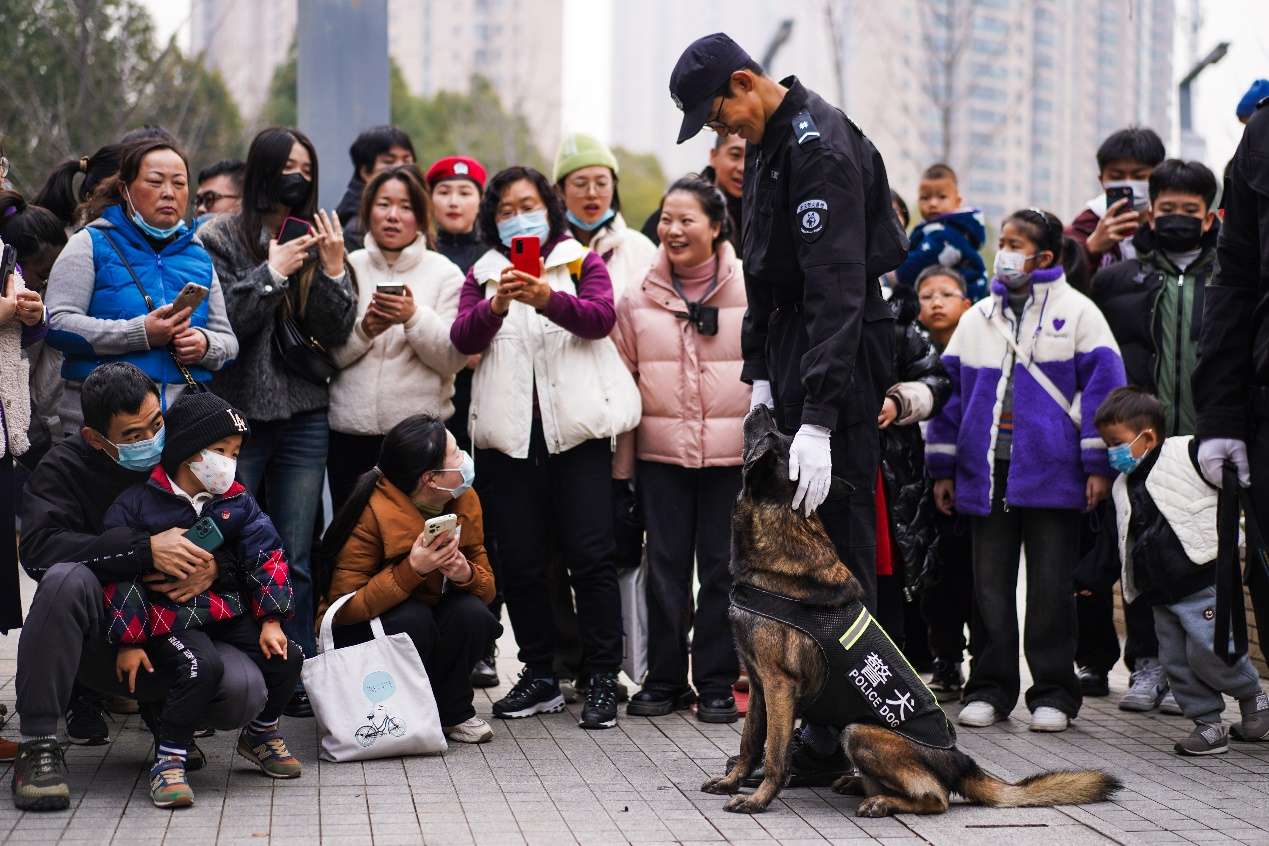 1月7日,湖北省武漢市公安局舉行主題為“平安武漢 共同締造”的警營開放日活動,黨風(fēng)政風(fēng)警風(fēng)監(jiān)督員、醫(yī)護工作者、網(wǎng)約車司機、金融從業(yè)人員等社會各界萬余名群眾來到現(xiàn)場,零距離觀摩、體驗公安工作和警營文化。圖為群眾與剛剛完成搜毒演練科目的警犬及其訓(xùn)導(dǎo)員互動。
