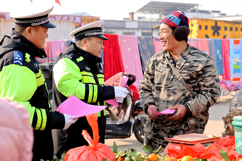 春節(jié)臨近,山東省棗莊市公安局市中分局交通警察大隊開展“鄉(xiāng)村‘年集’講安全”活動,組織民警深入鄉(xiāng)村“年集”宣傳交通安全知識。圖為民警向駕駛機動三輪車的攤主宣傳安全行駛知識。