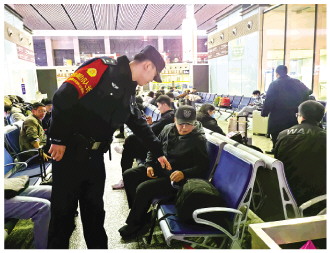 圖為民警提醒夜間候車(chē)旅客注意保管隨身物品。