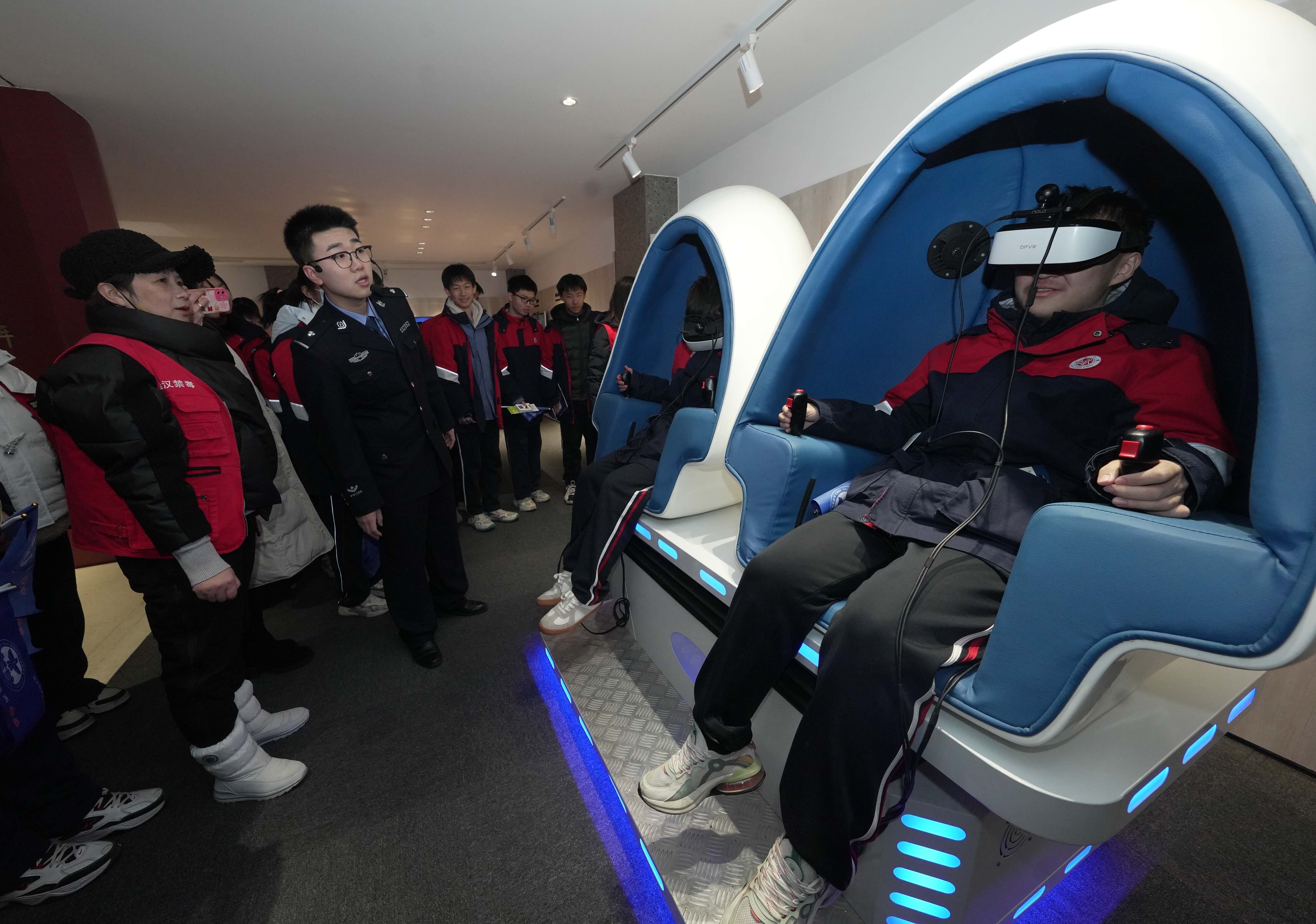 2月26日,湖北武漢3136所中小學(xué)、幼兒園正式開學(xué),武漢警方按照“一校一方案、一專班、一領(lǐng)導(dǎo)”要求,全面筑牢校園安全屏障。圖為武昌區(qū)公安分局民警走進(jìn)武漢中學(xué)開展“開學(xué)第一課”宣講活動,學(xué)生們借助VR設(shè)備學(xué)習(xí)禁毒、反詐等法律知識。
