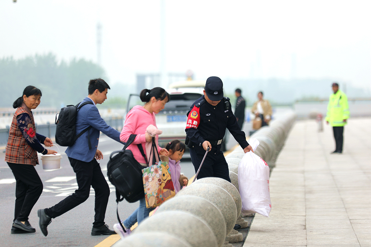 5月5日,安徽省舒城縣公安局千人橋派出所聯(lián)合高鐵東站警務(wù)站民警輔警在入站口平臺疏導(dǎo)交通、服務(wù)群眾,確保返程旅客平安出行。圖為執(zhí)勤輔警幫助旅客快速通過車輛通道。