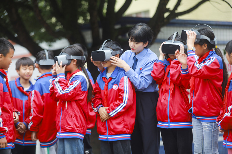 6月17日,貴州省黔西市人民檢察院組織檢察官走進轄區(qū)雨朵鎮(zhèn)扯泥小學(xué),開展禁毒主題宣傳活動,通過展示毒品模型、發(fā)放宣傳頁、VR眼鏡認識毒品危害等,向?qū)W生講解新型毒品種類、特征和危害,提高學(xué)生識毒、拒毒、防毒意識。圖為檢察官指導(dǎo)小學(xué)生利用VR眼鏡認識毒品的危害。
