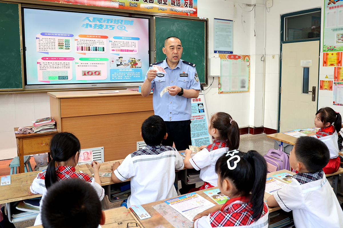 近日,山東省萊州市公安局經偵大隊組織民警來到轄區(qū)各小學校園開展普法教育,進一步促進學生樹立遵紀守法意識,提高安全防范能力。圖為民警為小學生講解如何識別假幣。