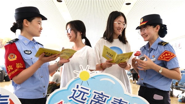 在國(guó)際禁毒日來臨之際,杭州鐵路公安處聯(lián)合客運(yùn)部門開展形式多樣的禁毒主題宣傳教育活動(dòng)。圖為民警在候車室向旅客發(fā)放禁毒宣傳資料。