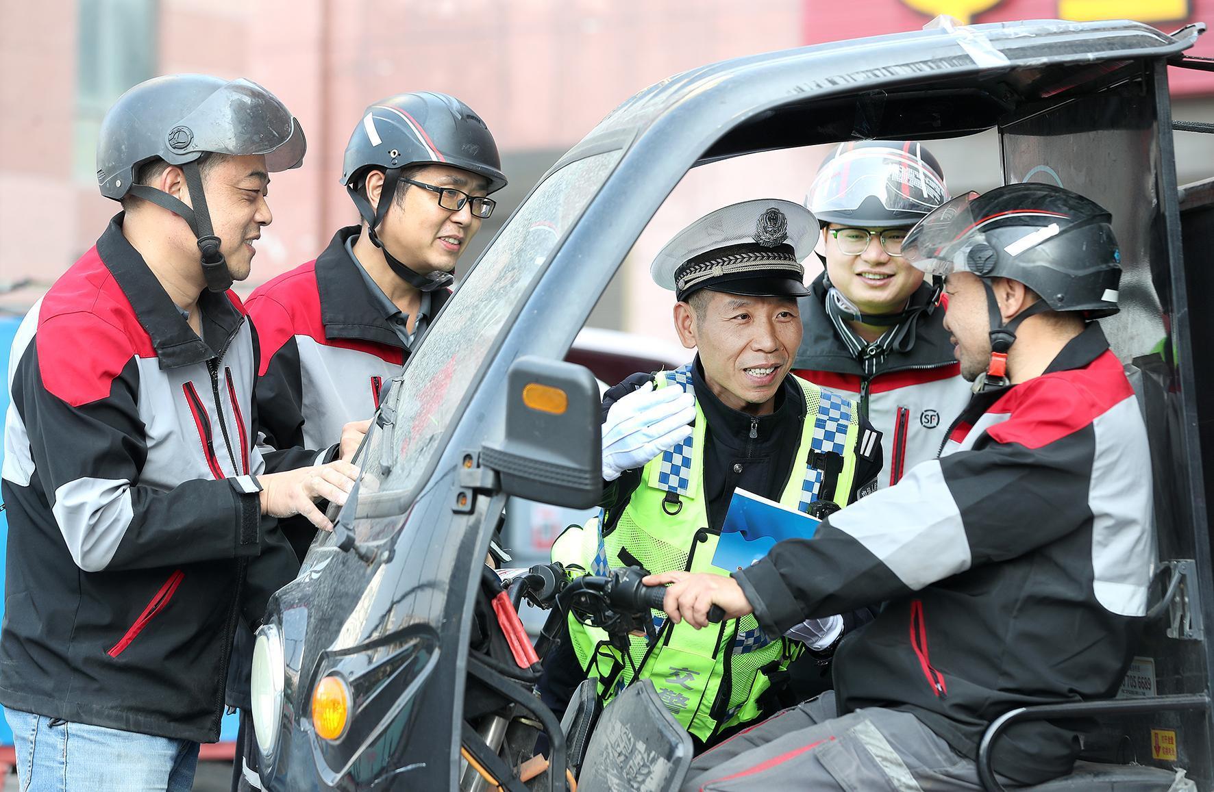 近日,湖北省荊門市公安局交警支隊組織民警走進轄區(qū)快遞公司開展“一盔一帶”安全守護行動。圖為11月11日,民警向快遞員講解道路交通安全法律知識。
