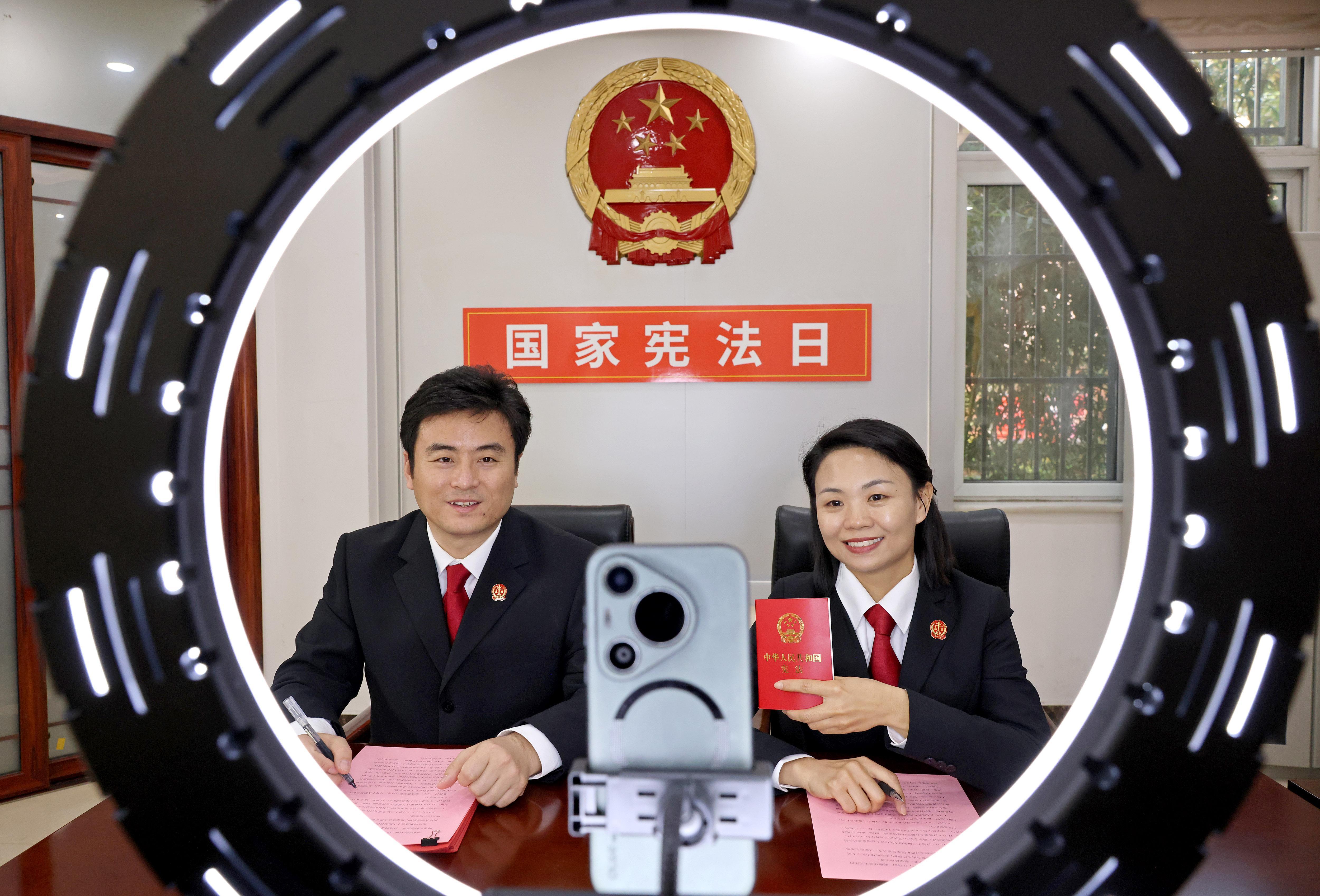 12月3日,山東省棗莊市市中區(qū)人民法院開展“憲法宣傳周”活動(dòng),兩名法官通過線上直播方式向觀眾宣傳憲法知識(shí)。圖為法官講解國家憲法日的由來。