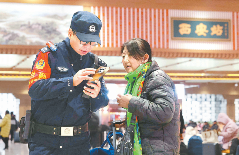 1月1日,西安鐵路公安局西安公安處民警堅(jiān)守崗位,護(hù)航旅客平安出行。圖為民警在西安火車(chē)站候車(chē)室?guī)椭每徒鉀Q問(wèn)題。