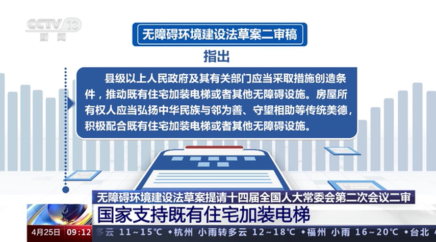 無障礙環(huán)境建設(shè)法草案提請十四屆全國人大常委會第二次會議二審 國家支持既有住宅加裝電梯