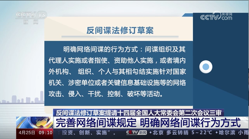 反間諜法修訂草案提請十四屆全國人大常委會第二次會議三審 完善網(wǎng)絡(luò)間諜規(guī)定 明確網(wǎng)絡(luò)間諜行為方式
