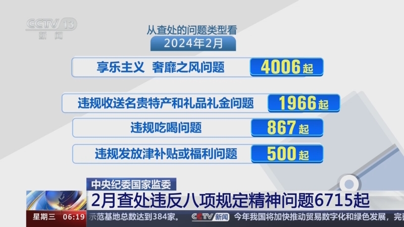 中央紀委國家監(jiān)委 2月查處違反八項規(guī)定精神問題6715起
