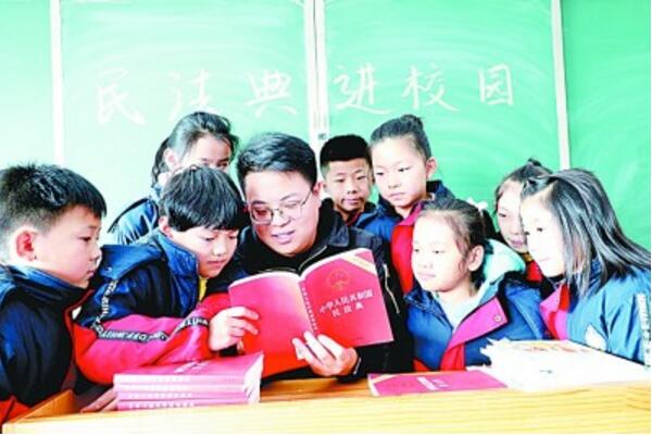 河北省邢臺(tái)市平鄉(xiāng)縣司法局工作人員為孩子們講解民法典知識(shí)。光明圖片/范欽龍攝