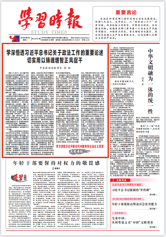 當(dāng)前,全黨上下正在深入開(kāi)展學(xué)習(xí)貫徹習(xí)近平新時(shí)代中國(guó)特色社會(huì)主義思想主題教育。全國(guó)政法機(jī)關(guān)和廣大政法干警要認(rèn)真貫徹落實(shí)黨中央決策部署,堅(jiān)持知行合一、學(xué)以致用,堅(jiān)持聯(lián)系實(shí)際、立足崗位,全面、系統(tǒng)、深入學(xué)習(xí)貫徹習(xí)近平總書(shū)記關(guān)于政法工作的重要論述,更加深刻體悟真理的味道、思想的力量,更加深刻領(lǐng)悟“兩個(gè)確立”的決定性意義,更加自覺(jué)增強(qiáng)“四個(gè)意識(shí)”、堅(jiān)定“四個(gè)自信”、做到“兩個(gè)維護(hù)”,進(jìn)一步提升維護(hù)國(guó)家政治安全、確保社會(huì)大局穩(wěn)定、促進(jìn)社會(huì)公平正義、保障人民安居樂(lè)業(yè)的能力水平,推動(dòng)新時(shí)代政法事業(yè)不斷邁上新臺(tái)階、開(kāi)辟新境界。