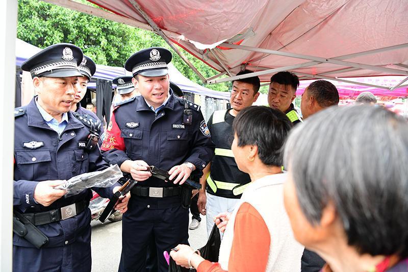 5月4日,安徽省阜陽(yáng)市阜南縣公安局趙集派出所民輔警聯(lián)合治安隊(duì)員在集市上提醒群眾注意安全防范。針對(duì)農(nóng)村集市物品、資金、人員流動(dòng)量大的特點(diǎn),阜南縣公安局趙集派出所聯(lián)合鎮(zhèn)政府治安辦組織民輔警和治安員開(kāi)展集市不間斷巡邏,嚴(yán)防盜竊等侵財(cái)性案件發(fā)生,提升群眾安全感。