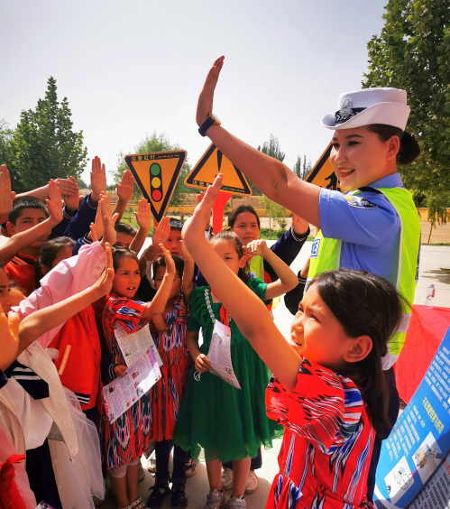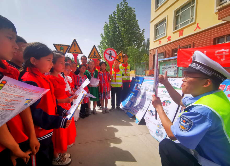 圖為和田市公安局黨員民警志愿服務(wù)隊(duì)的交警來到古江巴格鄉(xiāng)紅星村小學(xué),向?qū)W生宣傳交通安全知識。