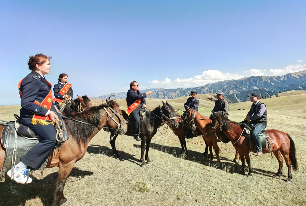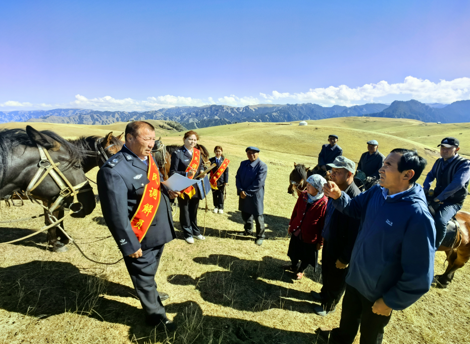 近年來,新疆維吾爾自治區(qū)木壘哈薩克自治縣司法局依托各牧區(qū)基層司法所,在該縣部分鄉(xiāng)鎮(zhèn)組建了“馬背調(diào)解隊”,深入牧區(qū)上門為牧民群眾排憂解難,為牧民群眾提供便捷高效的調(diào)解服務(wù),打通人民調(diào)解服務(wù)牧民群眾的“最后一公里”。圖為8月16日,木壘縣司法局雀仁司法所“馬背調(diào)解隊”在山區(qū)草原牧場開展矛盾糾紛排查化解工作。