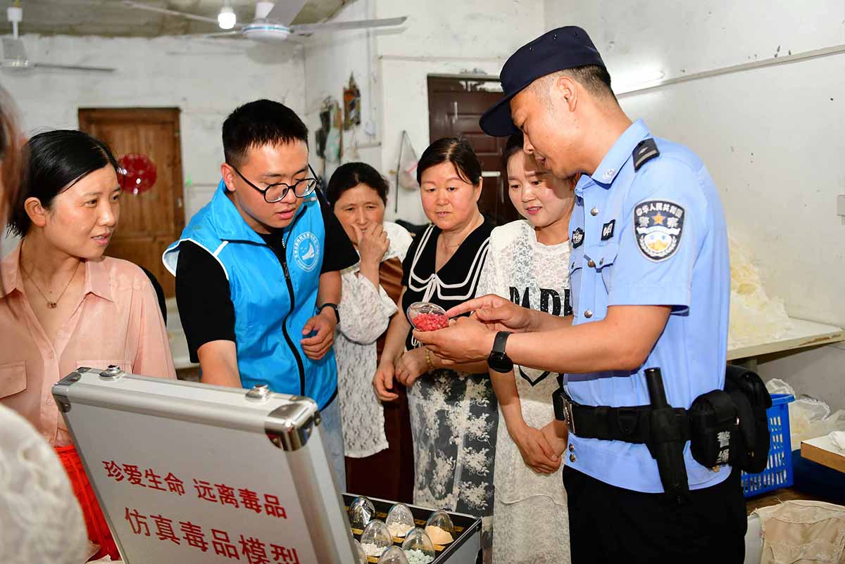 5月20日,安徽省阜南縣鹿城鎮(zhèn)駱寨社區(qū)文明實踐站聯(lián)合縣公安局水上派出所開展“遠離毒品、幸福家園 ”禁毒宣傳進微型企業(yè)活動,民警與工作人員利用仿真毒品模具向群眾講解如何辨別毒品類型和毒品的危害性,提高識毒、防毒能力。