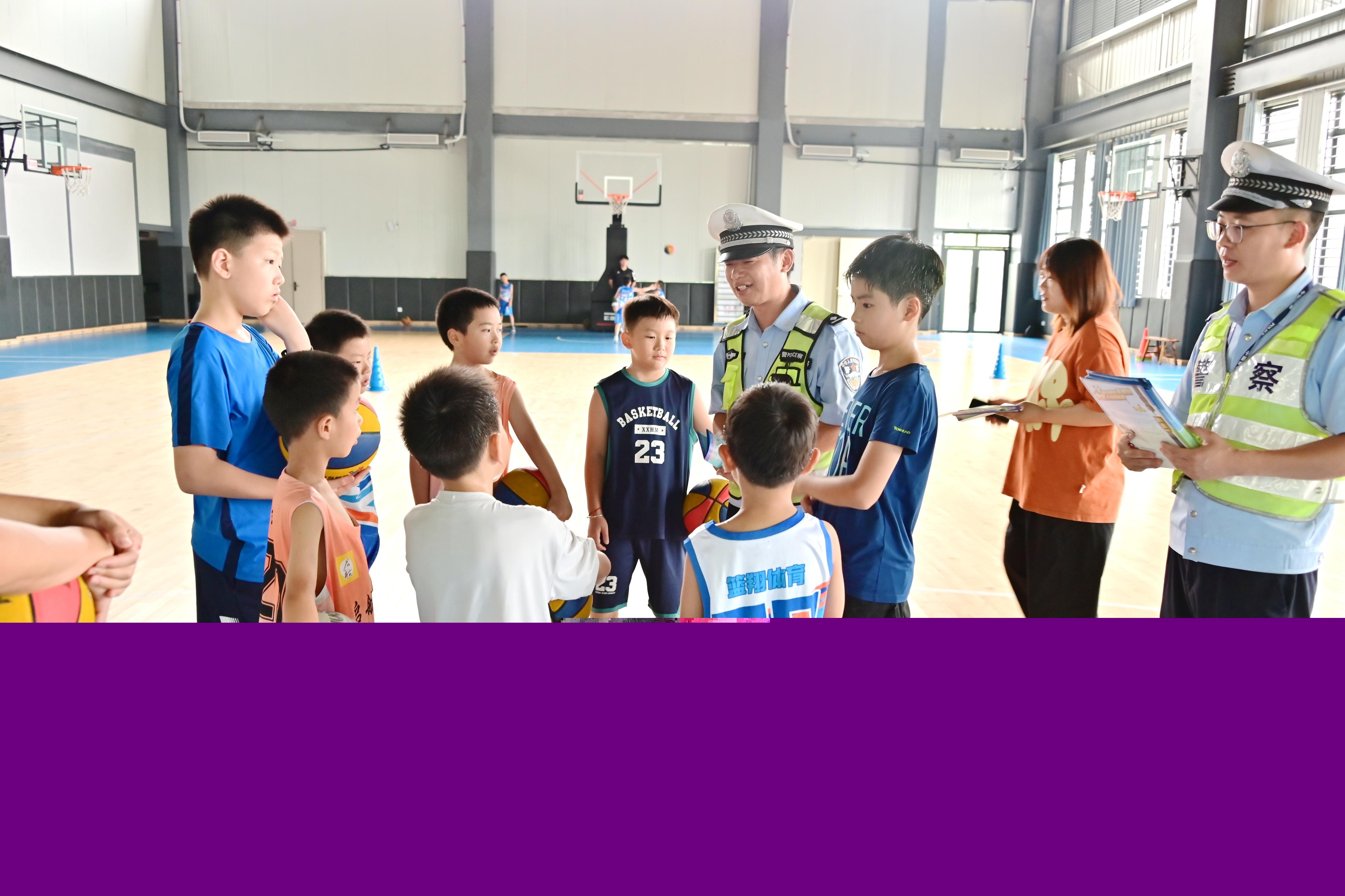 圖為7月23日,民輔警在武寧縣藍(lán)翔球館向小球員們宣傳交通安全知識(shí)并進(jìn)行投籃互動(dòng)。
