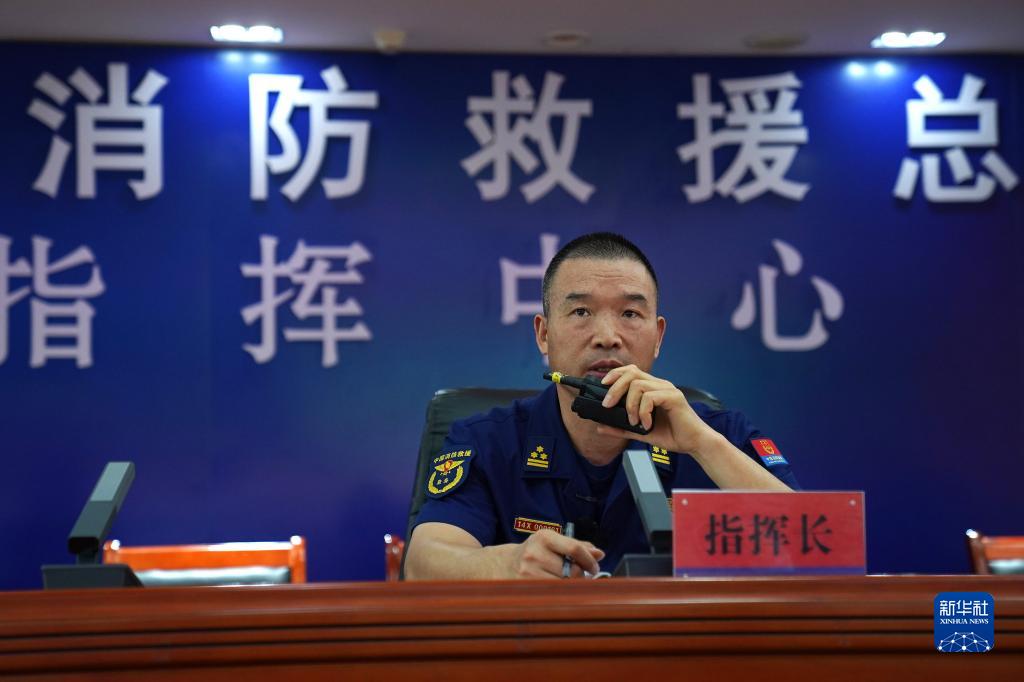 江西省消防救援總隊(duì)指揮中心專業(yè)技術(shù)一級(jí)指揮長(zhǎng)李勝利在江西消防救援總隊(duì)指揮中心進(jìn)行遠(yuǎn)程調(diào)度(2022年9月14日攝)。新華社記者 萬(wàn)象 攝