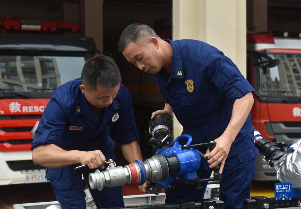 在江西省南昌市消防救援支隊(duì)特勤大隊(duì)營(yíng)院內(nèi),李勝利(右)在檢查裝備器材(2020?年10月8日攝)。新華社發(fā)(熊超 攝)
