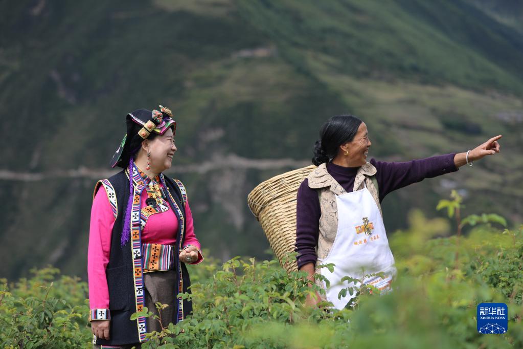 9月25日,陳望慧在四川阿壩州小金縣新橋鄉(xiāng)共和村與村民喻福良探討種植經(jīng)驗。新華社記者 劉瓊 攝