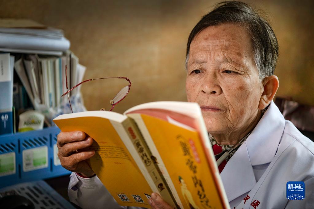 在陜西佳縣中醫(yī)院門診義診的路生梅,沒有病人時堅(jiān)持看書學(xué)習(xí)(2020年4月8日攝)。新華社記者 陶明 攝