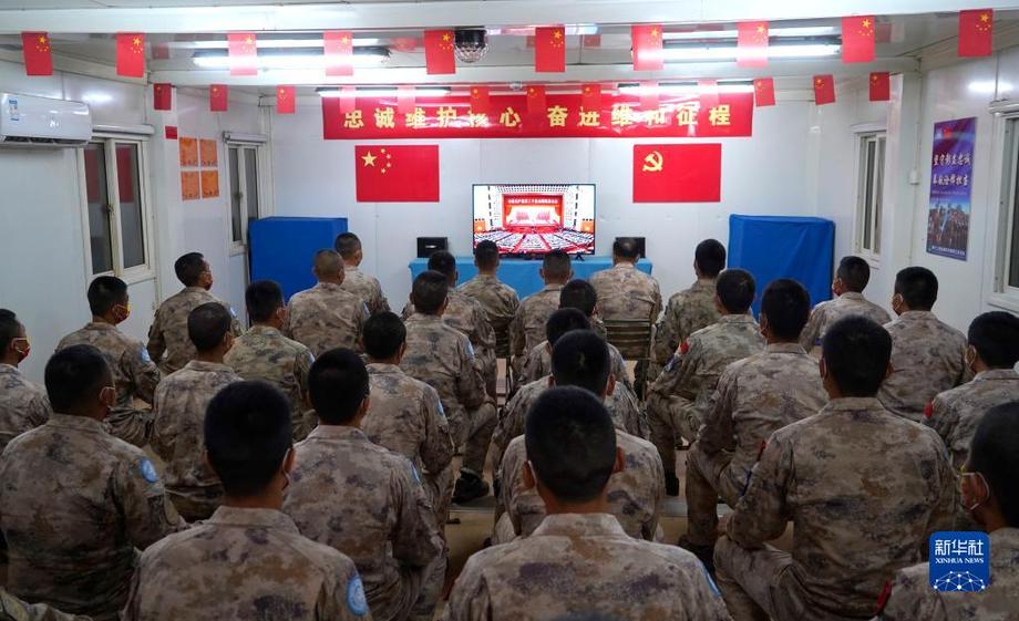 10月16日,中國第十二批赴南蘇丹(瓦烏)維和工兵分隊官兵收看中國共產黨第二十次全國代表大會開幕會。新華社(張益瑋 攝)