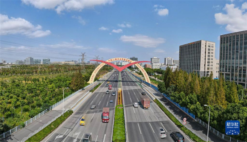 這是中國(上海)自由貿(mào)易試驗區(qū)保稅片區(qū)的標(biāo)志性景觀“海鷗門”(10月17日攝,無人機照片)。新華社記者 方喆 攝