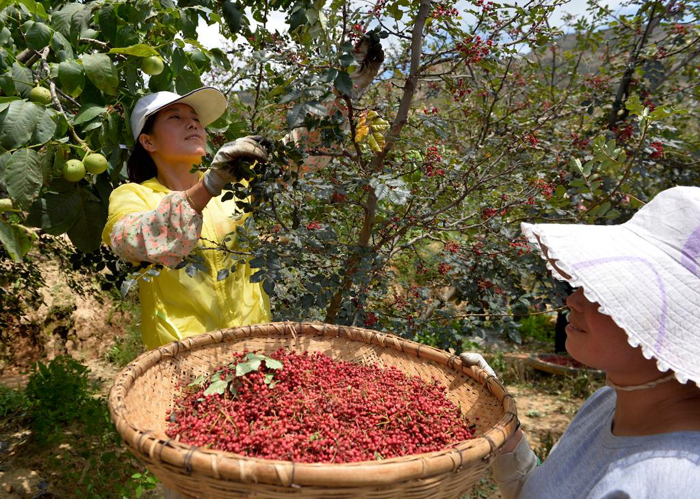 椒農(nóng)在隴南市武都區(qū)馬街鎮(zhèn)采摘花椒。(新華社發(fā))