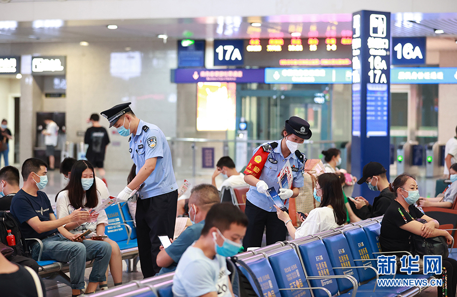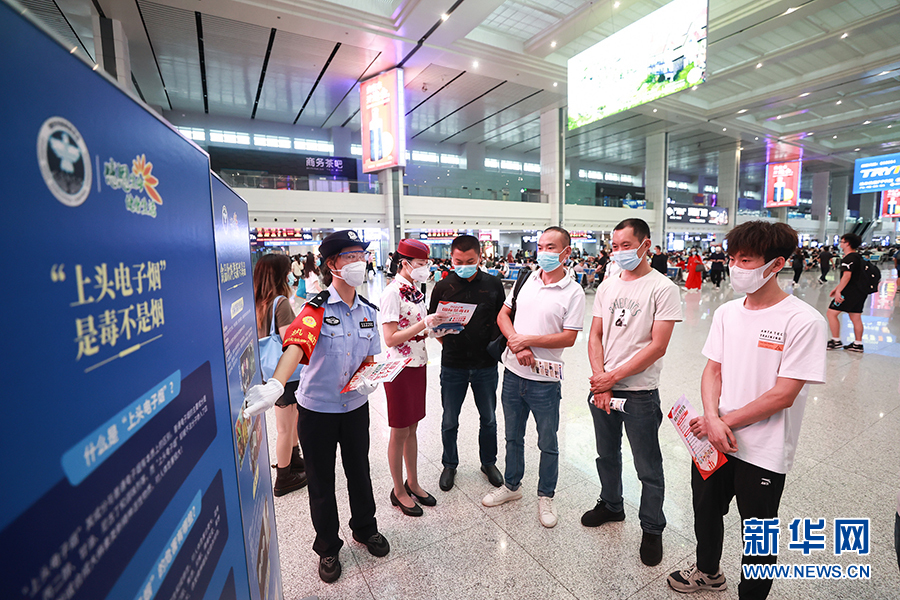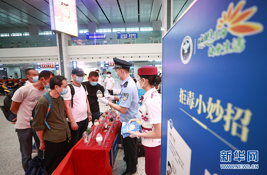 6月23日,民警和鐵路職工在重慶北站候車廳向旅客開展禁毒宣傳。新華網(wǎng) 發(fā)