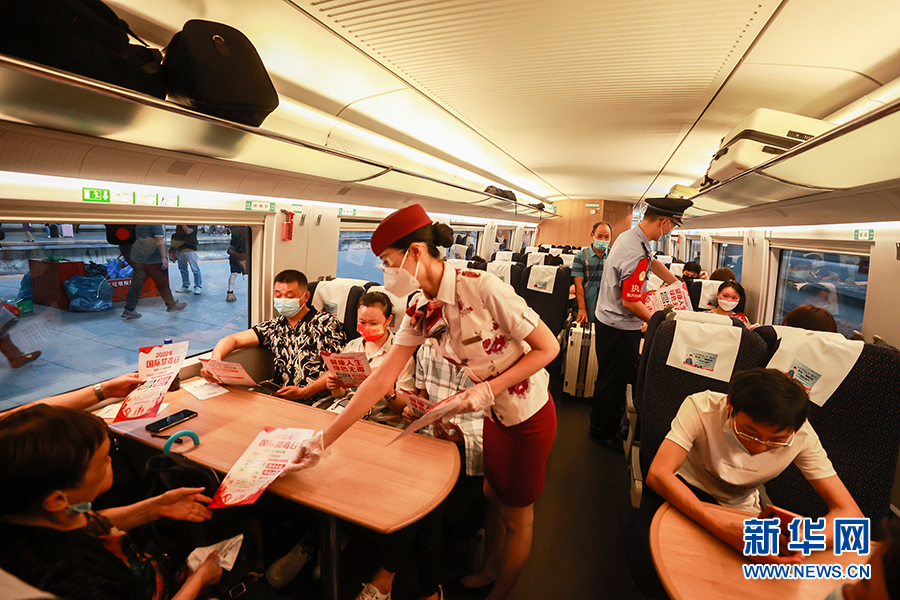 6月23日,民警和鐵路職工在列車上向旅客開展禁毒宣傳。新華網(wǎng) 發(fā)