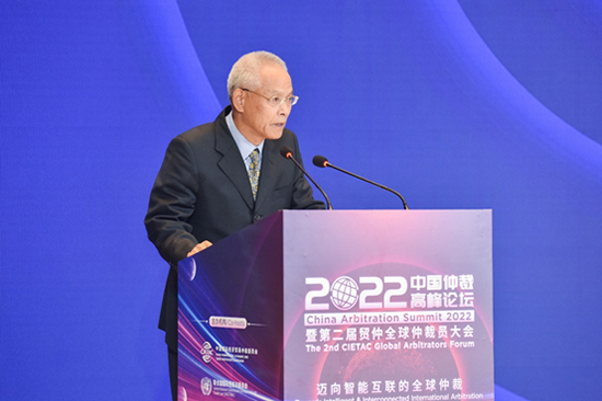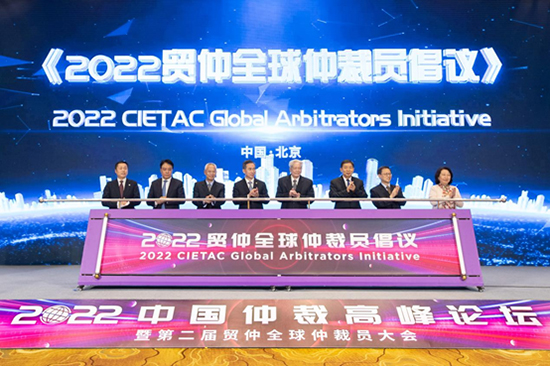 (任鴻斌會長、王勝明副主任、熊選國副部長、劉貴祥專委、柯良棟副會長、費(fèi)宗祎榮譽(yù)仲裁員、鄭若驊仲裁員、王承杰秘書長共同支持發(fā)布《2022貿(mào)仲全球仲裁員倡議》)